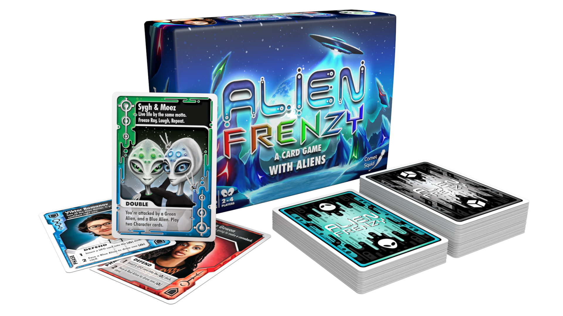 Alien Frenzy by Victorian game creators, Comet Squid is a card game about an alien invasion. Players are in charge of recruiting a team of crazy characters to help them fend off various aliens as they wander the Earth creating havoc.